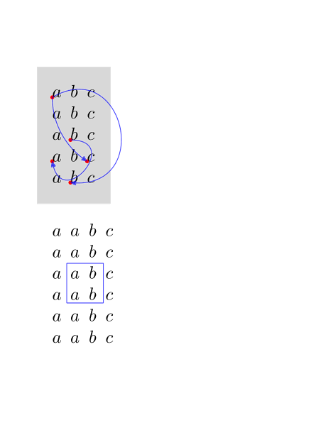 \setupheadertexts[] \setuppapersize[A7] \setupbodyfont[12pt] \starttext \startuseMPgraphic{whatever-1} fill OverlayBox withcolor "lightgray" ; drawdot anchorxy("one", 0, 1) withpen pencircle scaled 1mm withcolor "red" ; drawdot anchorxy("one", 0, 2) withpen pencircle scaled 1mm withcolor "red" ; drawdot anchorxy("two", 0, 1) withpen pencircle scaled 1mm withcolor "red" ; drawdot anchorxy("two", 0, 2) withpen pencircle scaled 1mm withcolor "red" ; drawdot anchorxy("three", 0, 1) withpen pencircle scaled 1mm withcolor "red" ; setbounds currentpicture to OverlayBox ; \stopuseMPgraphic \startuseMPgraphic{whatever-2} pair a ; a := anchorxy("one", 0, 1) ; pair b ; b := anchorxy("one", 0, 2) ; drawarrow anchorxy("one", 0, 1) { right } .. anchorxy("one", 0, 2) withcolor "blue" withtransparency (1,.75) ; drawarrow anchorxy("two", 0, 1) { down } .. anchorxy("two", 0, 2) withcolor "blue" withtransparency (1,.75) ; drawarrow anchorxy("two", 0, 1) { dir 30 } .. anchorxy("three", 0, 1) withcolor "blue" withtransparency (1,.75) ; setbounds currentpicture to OverlayBox ; \stopuseMPgraphic \defineoverlay[whatever-1][\useMPgraphic{whatever-1}] \defineoverlay[whatever-2][\useMPgraphic{whatever-2}] \framed [synchronize=yes, align=normal, offset=10pt, frame=off, background={whatever-1,foreground,whatever-2}] {\startmathmatrix \NC \markanchor{two}{0}{1}a \NC b \NC c \NR \NC a \NC b \NC c \NR \NC a \NC \markanchor{one}{0}{1}b \NC c \NR \NC \markanchor{one}{0}{2}a \NC b \NC \markanchor{two}{0}{2}c \NR \NC a \NC \markanchor{three}{0}{1}b \NC c \NR \stopmathmatrix} \startuseMPgraphic{whatever-3} pair a ; a := anchorxy("a", 0, 1) ; pair b ; b := anchorxy("a", 0, 2) ; draw boundingbox (a--b) leftenlarged .25EmWidth rightenlarged EmWidth topenlarged StrutHeight bottomenlarged .5StrutDepth withcolor "blue" withtransparency (1,.75) ; setbounds currentpicture to OverlayBox ; \stopuseMPgraphic \defineoverlay[whatever-3][\useMPgraphic{whatever-3}] \framed [synchronize=yes, align=normal, offset=10pt, frame=off, background=whatever-3] {\startmathmatrix \NC a \NC a \NC b \NC c\NR \NC a \NC a \NC b \NC c\NR \NC a \NC \markanchor{a}{0}{1}a \NC b \NC c\NR \NC a \NC a \NC \markanchor{a}{0}{2} b \NC c\NR \NC a \NC a \NC b \NC c\NR \NC a \NC a \NC b \NC c\NR \stopmathmatrix} \stoptext