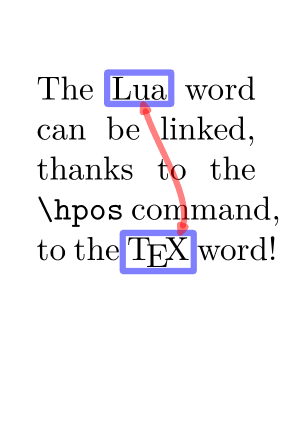\setupheadertexts[] \setuppapersize[A8] \setupbodyfont[16pt] \setupalign[tolerant] \startuseMPgraphic{MPMyPage} StartPage ; path pa, pb, pab; pa := (\MPll{locA} -- \MPlr{locA} -- \MPur{locA} -- \MPul{locA} -- cycle) enlarged 2pt; pb := (\MPll{locB} -- \MPlr{locB} -- \MPur{locB} -- \MPul{locB} -- cycle) enlarged 2pt; pab := (center pa){dir(-80)} .. (center pb){dir(-155)}; draw pa withpen pencircle scaled 3pt withcolor transparent(1,0.5,blue); draw pb withpen pencircle scaled 3pt withcolor transparent(1,0.5,blue); pab := pab cutbefore (pab intersectionpoint pa) ; pab := pab cutafter (pab intersectionpoint pb) ; drawdblarrow pab withpen pencircle scaled 3pt withcolor transparent(1,0.5,red); StopPage ; \stopuseMPgraphic \defineoverlay [OLMyPage] [\useMPgraphic{MPMyPage}] \setupbackgrounds [page] [background={foreground,OLMyPage}] \starttext The \hpos{locA}{\LUA} word can be linked, thanks to the \tex{hpos} command, to the \hpos{locB}{\TeX} word! \stoptext
