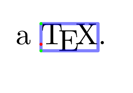 \setupheadertexts[] \setuppapersize[A8,landscape] \setupbodyfont[48pt] \startuseMPgraphic{MPMyPage} StartPage ; draw \MPll{locA} -- \MPlr{locA} -- \MPur{locA} -- \MPul{locA} -- cycle withpen pencircle scaled 5pt withcolor transparent(1,0.5,blue); draw (\MPx{locA},\MPy{locA}) withpen pencircle scaled 5pt withcolor red ; draw (\MPx{locA},\MPy{locA} - \MPd{locA}) withpen pencircle scaled 5pt withcolor green; draw (\MPx{locA},\MPy{locA} + \MPh{locA}) withpen pencircle scaled 5pt withcolor green; draw (\MPx{locA} + \MPw{locA},\MPy{locA}) withpen pencircle scaled 5pt withcolor magenta ; StopPage ; \stopuseMPgraphic \defineoverlay [OLMyPage] [\useMPgraphic{MPMyPage}] \setupbackgrounds [page] [background=OLMyPage] \starttext a \hpos{locA}{\TeX}. \stoptext