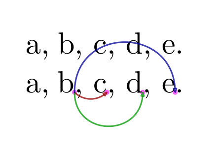 \setupheadertexts[] \setuppapersize[A8,landscape] \setupbodyfont[30pt] \startuseMPgraphic{MPpoints} pickup pencircle scaled 5pt ; color mycolor; mycolor := magenta ; draw anchorxy("one", 0, 1) withcolor mycolor withtransparency (1,.6); draw anchorxy("one", 0, 2) withcolor mycolor withtransparency (1,.6); draw anchorxy("one", 0, 3) withcolor mycolor withtransparency (1,.6); draw anchorxy("two", 0, 1) withcolor mycolor withtransparency (1,.6); setbounds currentpicture to OverlayBox ; \stopuseMPgraphic \startuseMPgraphic{MParrows} pickup pencircle scaled 1.5pt ; drawarrow anchorxy("one", 0, 1) {dir -45} .. anchorxy("one", 0, 2) withcolor "darkred" withtransparency (1,.75) ; drawarrow anchorxy("one", 0, 1) {down} .. anchorxy("one", 0, 3) withcolor "darkgreen" withtransparency (1,.75) ; drawarrow anchorxy("one", 0, 1) {up} .. anchorxy("two", 0, 1) withcolor "darkblue" withtransparency (1,.75) ; setbounds currentpicture to OverlayBox ; \stopuseMPgraphic \defineoverlay [OLback] [\useMPgraphic{MPpoints}] \defineoverlay [OLfront] [\useMPgraphic{MParrows}] \setupframed [offset=0pt, strut=yes, location=top, frame=off] \starttext a, \framed{b, c, d, e.} a, \framed[synchronize=yes, background={OLback,foreground,OLfront}] {b\markanchor{one}{0}{1}, c\markanchor{one}{0}{2}, d\markanchor{one}{0}{3}, e\markanchor{two}{0}{1}.} \stoptext