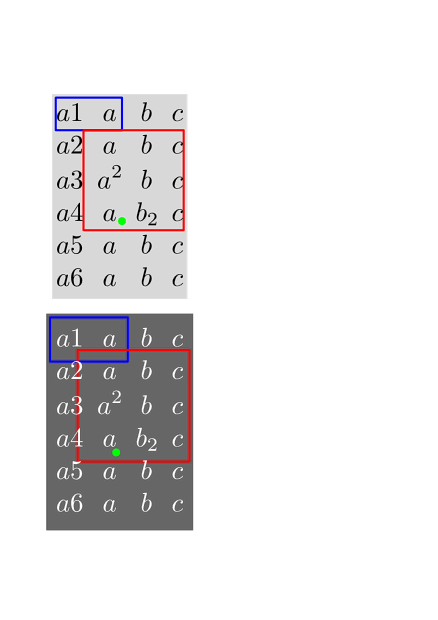\setupheadertexts[] \setuppapersize[A7] \setupbodyfont[13pt] \starttext \startuseMPgraphic{whatever-5} fill OverlayBox withcolor "lightgray" ; draw matrixbox (1, 1) (2, 1) withpen pencircle scaled 1pt withcolor "blue" ; draw matrixbox (2, 2) (4, 4) withpen pencircle scaled 1pt withcolor "red" ; draw anchorxy("matrix", 3, 4) withpen pencircle scaled 4pt withcolor "green"; setbounds currentpicture to OverlayBox ; \stopuseMPgraphic \defineoverlay[whatever-5][\useMPgraphic{whatever-5}] \framed [synchronize=background, align=normal, frame=off, background=whatever-5] {\setmathmatrixanchoring[both]% left|right|both|yes % {\setmathmatrixanchoring[right]% left|right|both|yes \startmathmatrix \NC a1 \NC a \NC b \NC c\NR \NC a2 \NC a \NC b \NC c\NR \NC a3 \NC a^2 \NC b \NC c\NR \NC a4 \NC a \NC b_2 \NC c\NR \NC a5 \NC a \NC b \NC c\NR \NC a6 \NC a \NC b \NC c\NR \stopmathmatrix} \startuseMPgraphic{whatever-5} fill OverlayBox withcolor "darkgray" ; draw matrixbox (1, 1) (2, 1) enlarged OverlayOffset shifted paired(OverlayOffset) withpen pencircle scaled 1pt withcolor "blue" ; draw matrixbox (2, 2) (4, 4) enlarged OverlayOffset shifted paired(OverlayOffset) withpen pencircle scaled 1pt withcolor "red" ; draw anchorxy("matrix", 3, 4) withpen pencircle scaled 4pt withcolor "green"; setbounds currentpicture to OverlayBox ; \stopuseMPgraphic \blank \framed [synchronize=background, align=normal, frame=off, background=whatever-5, backgroundoffset=.5ex, foregroundcolor=white] {\setmathmatrixanchoring[yes]% left|right|both|yes \startmathmatrix \NC a1 \NC a \NC b \NC c\NR \NC a2 \NC a \NC b \NC c\NR \NC a3 \NC a^2 \NC b \NC c\NR \NC a4 \NC a \NC b_2 \NC c\NR \NC a5 \NC a \NC b \NC c\NR \NC a6 \NC a \NC b \NC c\NR \stopmathmatrix} \stoptext