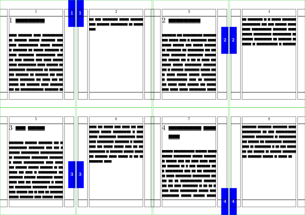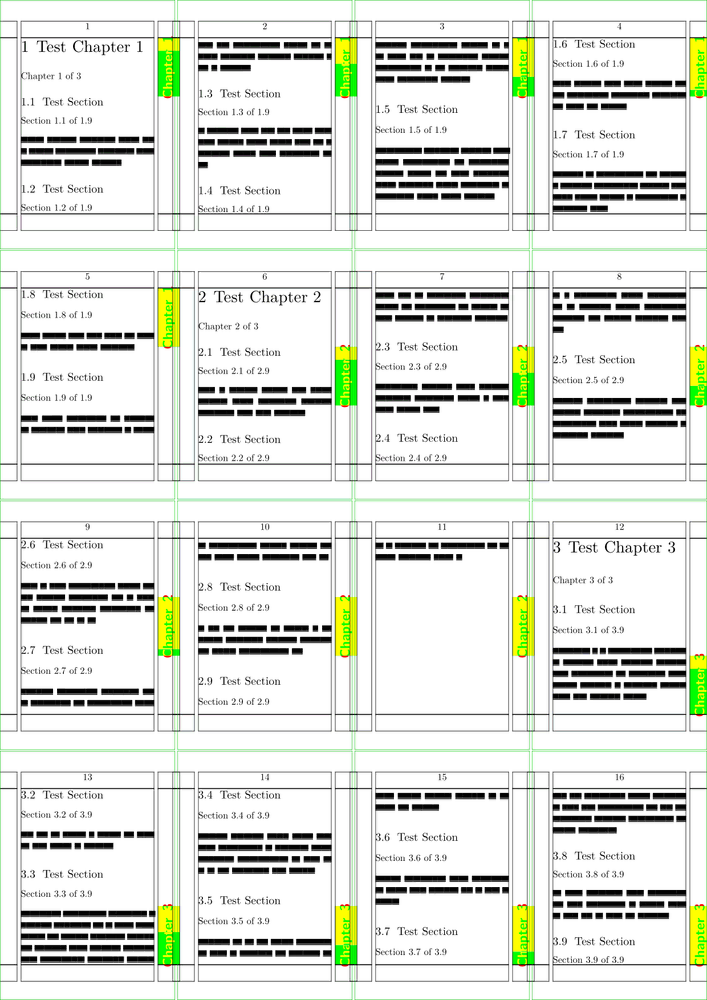 % these first lines are just for wiki layout and visualisation \setuppapersize[A8][A5,landscape] \showframe \setuppaper[nx=4,ny=2] \setuparranging[XY] \usemodule[visual] \def\currentchapternumber {\somenamedheadnumber{chapter}{current}} \def\lastchapternumber {\somenamedheadnumber{chapter}{last}} \setuppagenumbering [alternative=doublesided] \setupbackgrounds [page] [background=thumbs] \defineoverlay [thumbs] [\setups{thumbs}] \newdimen\thumbheight \startsetups thumbs \ifnum \lastchapternumber > 0 \thumbheight=\dimexpr\paperheight/\lastchapternumber\relax \fi \vbox to \paperheight \bgroup \vskip \currentchapternumber \thumbheight \vskip -1 \thumbheight \doifoddpageelse\hfill\donothing \framed [background=color, backgroundcolor=blue, frame=off, foregroundcolor=white, height=\thumbheight, width=5mm] {\bfa \currentchapternumber} \doifoddpageelse\donothing\hfill \vss \egroup \stopsetups \starttext \dorecurse{4} {\chapter{\fakewords{1}{5}} \fakewords{50}{100}} \stoptext