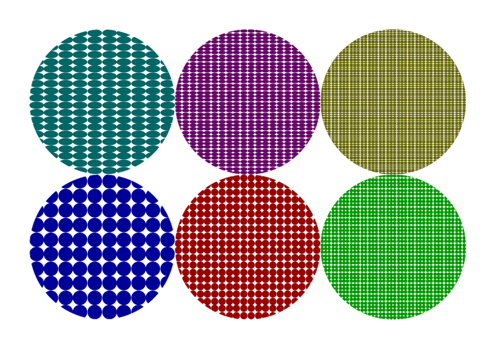 \starttext \startMPpage[offset=1cm] draw (fullcircle scaled 5cm shifted (0cm,0cm)) withpattern image (fill fullcircle scaled 1cm withcolor "darkblue" ;) withpatternscale (1/10,1/10) ; draw (fullcircle scaled 5cm shifted (5cm,0cm)) withpattern image (fill fullcircle scaled 5mm withcolor "darkred" ;) withpatternscale (1/20,1/20) ; draw (fullcircle scaled 5cm shifted (10cm,0cm)) withpattern image (fill fullcircle scaled 5mm withcolor "darkgreen" ;) withpatternscale (1/40,1/40) ; draw (fullcircle scaled 5cm shifted (0cm,5cm)) withpattern image (fill fullcircle scaled 1cm withcolor "darkcyan" ;) withpatternscale (1/10,1/20) ; draw (fullcircle scaled 5cm shifted (5cm,5cm)) withpattern image (fill fullcircle scaled 5mm withcolor "darkmagenta" ;) withpatternscale (1/20,1/40) ; draw (fullcircle scaled 5cm shifted (10cm,5cm)) withpattern image (fill fullcircle scaled 5mm withcolor "darkyellow" ;) withpatternscale (1/40,1/80) ; \stopMPpage \startMPpage[offset=1cm] fill fullcircle scaled 11cm withcolor "darkyellow" ; draw fullcircle scaled 10cm withpattern image (fill fullcircle scaled 1cm withcolor "darkblue" ;) ; draw fulldiamond scaled 8cm withpattern image (fill fulldiamond scaled 4mm withcolor "darkgreen" ;) rotated 15 ; draw fulltriangle scaled 9cm withpattern image (fill fulltriangle scaled 3mm withcolor "white" ;) rotated 45 ; draw fullcircle scaled 10cm withpattern image (draw textext("!") withcolor "middlegray" ;) rotated 45 ; draw fullcircle scaled 10cm withpen pencircle scaled 1mm withcolor "darkgray" ; \stopMPpage \startMPpage[instance=doublefun] fill fullcircle scaled 8cm withcolor "yellow" ; draw fullcircle scaled 8cm withpattern image (draw figure("t:/sources/cow.pdf") rotated 45;) withpatternscale 1/40 ; \stopMPpage \startMPpage[instance=doublefun] draw closedcurve(unitsquare xyscaled (200,200) shifted (0,-200)) withpattern image (fill closedcurve((fullcircle scaled 40 shifted (25,-25))) withcolor "darkgray" withopacity .5) withpatternscale (1,1) ; draw closedcurve(unitsquare xyscaled (200,200) shifted (0,-200)) withpattern image (fill closedcurve((fullcircle scaled 40 shifted (25,-25))) withcolor "darkred" withopacity .5) withpatternscale (1/2,1/2) ; draw closedcurve(unitsquare xyscaled (200,200) shifted (0,-200)) withpattern image (fill closedcurve((fullcircle scaled 40 shifted (25,-25))) withcolor "darkgreen" withopacity .5) withpatternscale (1/3,1/3) ; draw closedcurve(unitsquare xyscaled (200,200) shifted (0,-200)) withpattern image (fill closedcurve((fullcircle scaled 40 shifted (25,-25))) withcolor "darkblue" withopacity .5) withpatternscale (1/4,1/4) ; \stopMPpage % \startTEXpage \page \startMPcode{doublefun} draw closedcurve(unitsquare xyscaled (200,200) shifted (0,-400)) withpattern image (fill closedcurve((fullcircle scaled 40 shifted (25,-25)))) withpatternscale 1/8 ; \stopMPcode \blank \startMPcode{doublefun} draw closedcurve(unitsquare xyscaled (200,200) shifted (0,-400)) withpattern image (fill closedcurve((fullcircle scaled 40 shifted (25,-25)))) withpatternfloat true withpatternscale 1/8 ; \stopMPcode \page % \stopTEXpage \stoptext