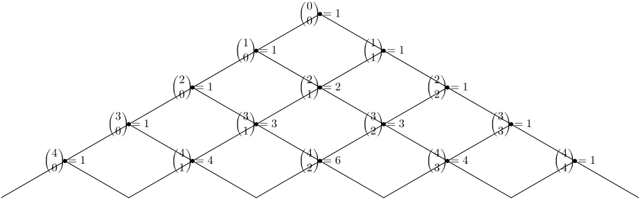 \startluacode local function fact (n) if n <= 0 then return 1 else return n * fact(n-1) end end local function ncr(n,r) return fact(n)/(fact(r)*fact(n-r)) end userdata.P = { fact = fact, ncr = ncr, } function MP.p_ncr(n, r) mp.print(ncr(n,r)) end function MP.p_ncr_x() mp.print(ncr(mp.scan.pair())) end \stopluacode \startMPcode numeric n,r,u,dx,dy,tt,final; u := 1.8cm; path p, q; pair A,now; A := dir(210)*u; dy := ypart A; dx := -2*(xpart A); for n=0 upto 4: for r=0 upto n: % tt := lua("mp.print(P.ncr(" & decimal n & "," & decimal r & " ))"); % tt := lua.MP.p_ncr(n,r); tt := runscript("MP.p_ncr_x()") (n,r) ; now := n*A + (r*dx,0); dotlabel(textext("\dm {\binom {" & decimal n & "}{" & decimal r & "} = " & decimal tt & "}"),now); draw (now+A) -- now -- (now+A+(dx,0)); endfor; endfor; \stopMPcode