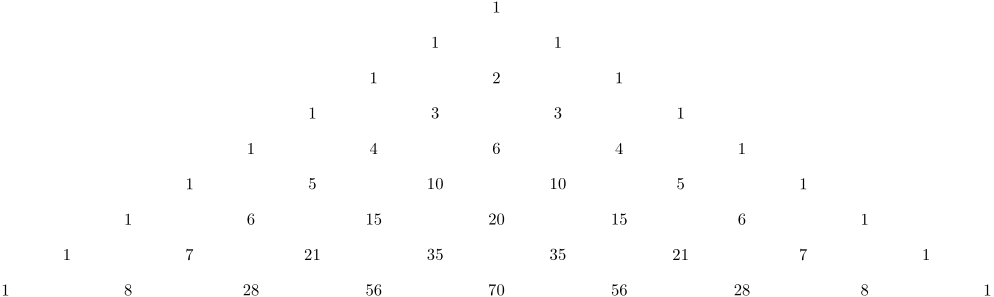 \startluacode local function fact (n) if n <= 0 then return 1 else return n * fact(n-1) end end local function ncr(n,r) return fact(n)/(fact(r)*fact(n-r)) end userdata.P = { fact = fact, ncr = ncr, } function MP.p_ncr(n, r) mp.print(ncr(n,r)) end function MP.p_ncr_x() mp.print(ncr(mp.scan.pair())) end \stopluacode \startMPcode numeric n,r,u,dx,dy,tt,final; u := 1.2cm; path p, q; pair A,now; A := dir(210)*u; dy := ypart A; dx := -2*(xpart A); for n=0 upto 8: for r=0 upto n: % tt := lua("mp.print(P.ncr(" & decimal n & "," & decimal r & " ))"); % tt := lua.MP.p_ncr(n,r); tt := runscript("MP.p_ncr_x()") (n,r) ; now := n*A + (r*dx,0); label(textext("$" & decimal tt & "$"),now); endfor; endfor; \stopMPcode