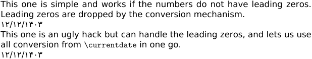 \definedfont[dejavusans] This one is simple and works if the numbers do not have leading zeros. Leading zeros are dropped by the conversion mechanism. \persiandecimals{\rawdate[jalali:to,d]}/% \persiandecimals{\rawdate[jalali:to,M]}/% \persiandecimals{\rawdate[jalali:to,y]} This one is an ugly hack but can handle the leading zeros, and lets us use all conversion from \type{\currentdate} in one go. \startluacode function persmap(s) local stream = tostring(s) local mapping = languages.decimals.persian local gsub = string.gsub return mapping and gsub(stream, ".", mapping) or stream end \stopluacode \def\persmap#1{\ctxlua{context(persmap("#1"))}} \def\mycurrentdate[#1]{\persmap{\rawdate[#1]}} \mycurrentdate[jalali:to,dd,/,mm,/,y]