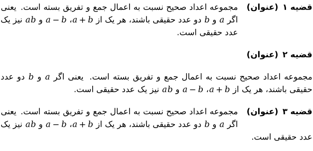 % hack to make dejavu typescript work \definefontfeature[default][arabic] \setupbodyfont[dejavu,sans] \setupdirections[bidi=global,method=one] \setupalign[r2l] \defineenumeration[theorem][headalign=r2l,alternative=text,text=قضیه ,numberconversion=persiandecimals,title=yes] \startbuffer[sam] \starttheorem[title=عنوان] مجموعه اعداد صحیح نسبت به اعمال جمع و تفریق بسته است. یعنی اگر $a$ و $b$ دو عدد حقیقی باشند، هر یک از $a+b$، $a-b$ و $ab$ نیز یک عدد حقیقی است. \stoptheorem \stopbuffer \getbuffer[sam] \setupenumeration[theorem][alternative=top] \getbuffer[sam] \setupenumeration[theorem][alternative=left,hang=2] \getbuffer[sam]