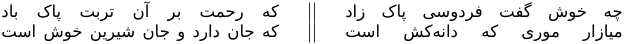 \usemodule[hemistich] \definedfont[dejavusans*arabic] \setupalign[r2l] \hemistiches {چه خوش گفت فردوسی پاک زاد} {که رحمت بر آن تربت پاک باد} \hemistiches {میازار موری که دانهکش است} {که جان دارد و جان شیرین خوش است}