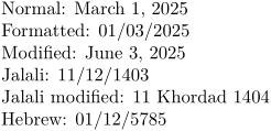 Normal: \currentdate\par Formatted: \currentdate[dd,/,mm,/,y]\par Modified: \date[m=6,d=3]\par Jalali: \currentdate[jalali:to,dd,/,mm,/,y]\par Jalali modified: \date[m=6][jalali:to,d,~,m:jalali,~,y]\par Hebrew: \currentdate[hebrew:to,dd,/,mm,/,y]
