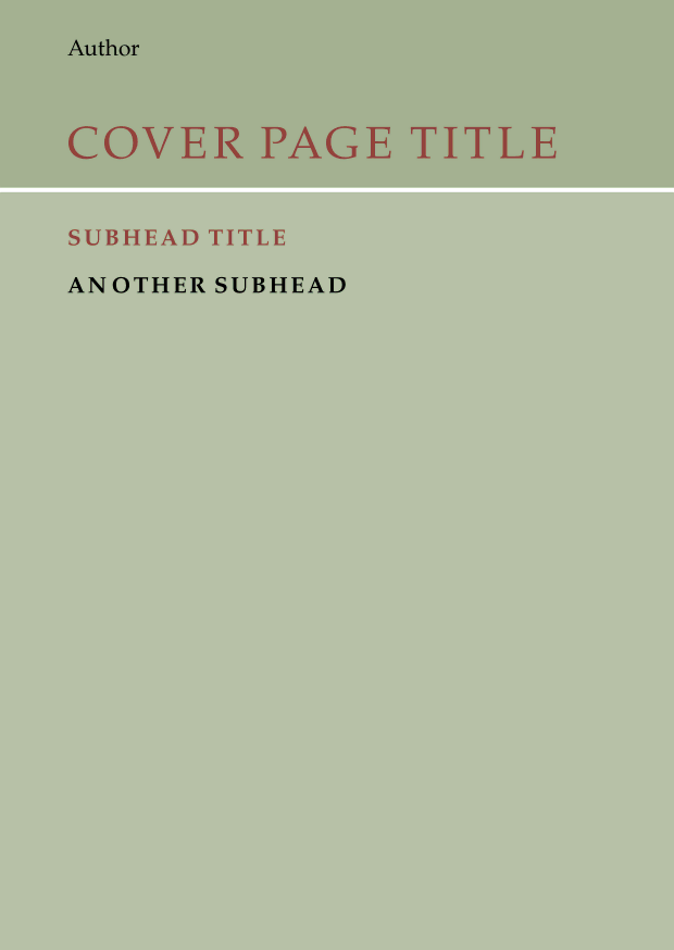 \setuppapersize[A6] \setupbodyfont [palatino] \definecolor [Top] [h=a5b291] \definecolor [Bottom] [h=b7c1a7] \definecolor [TitleColor] [h=96433a] \define[1]\titlefont{% \setcharacterkerning[extrakerning]% \cap \definedfont[#1]% \ignorespaces } \starttext \startMPpage StartPage ; numeric w ; w := bbwidth(Page) ; numeric h ; h := bbheight(Page) ; fill (unitsquare xyscaled (w,.8h)) withcolor \MPcolor{Bottom} ; fill (unitsquare xyscaled (w,.2h) yshifted .8h) withcolor \MPcolor{Top} ; draw (0,.8h) -- (w,.8h) withpen pensquare scaled 2pt withcolor white ; draw textext.rt("\definedfont[Serif at 10pt]Author") shifted (.1w,.95h) ; draw textext.rt("\titlefont{Serif at 20pt} Cover Page Title") shifted (.1w,.85h) withcolor \MPcolor{TitleColor} ; draw textext.rt("\titlefont{SerifBold at 10pt} Subhead Title") shifted (.1w,.75h) withcolor \MPcolor{TitleColor} ; draw textext.rt("\titlefont{SerifBold at 10pt} Another subhead") shifted (.1w,.70h) ; % picture p; p := externalfigure "matterhorn.png" ; % draw p scaled (w/bbwidth p) ; StopPage ; \stopMPpage \stoptext