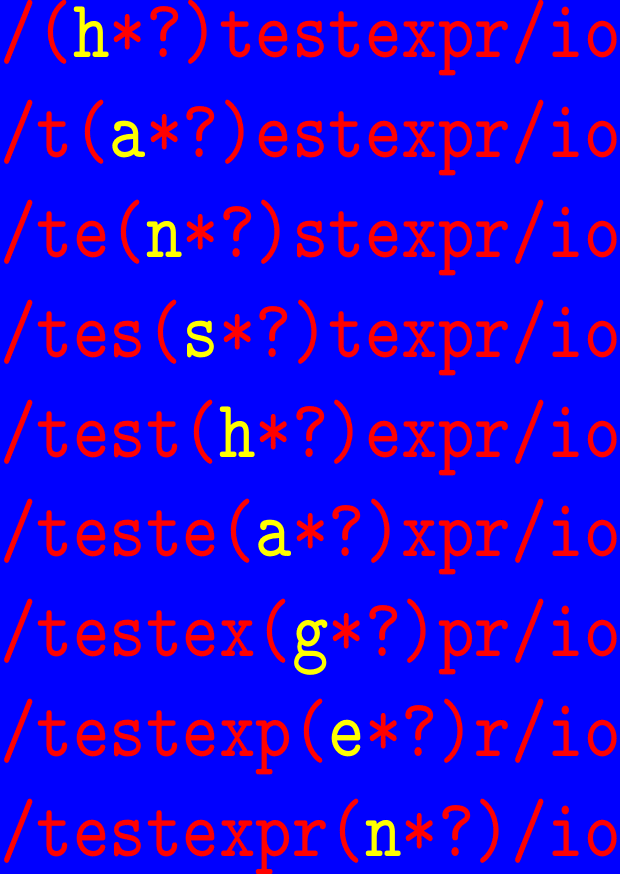 \setuppapersize[A6] \definetype[ytyp][color=yellow] \startbuffer[title] \type{/(}\ytyp{h}\type{*?)testexpr/io}\par \type{/t(}\ytyp{a}\type{*?)estexpr/io}\par \type{/te(}\ytyp{n}\type{*?)stexpr/io}\par \type{/tes(}\ytyp{s}\type{*?)texpr/io}\par \type{/test(}\ytyp{h}\type{*?)expr/io}\par \type{/teste(}\ytyp{a}\type{*?)xpr/io}\par \type{/testex(}\ytyp{g}\type{*?)pr/io}\par \type{/testexp(}\ytyp{e}\type{*?)r/io}\par \type{/testexpr(}\ytyp{n}\type{*?)/io}\par \stopbuffer \setupcolors[state=start] \definelayer [TitleGraphic] [width=\paperwidth, height=\paperheight] \setlayer [TitleGraphic] [preset=lefttop] {\scale [width=\paperwidth, height=\paperheight] {\framed [frame=off, offset=overlay, background=color, backgroundcolor=blue, foregroundcolor=red, align=normal] % {\setuptyping[before=,after=]\typebuffer[title]}}} {\getbuffer[title]}}} \setupbackgrounds[page][background=TitleGraphic] \starttext \startstandardmakeup \stopstandardmakeup \stoptext