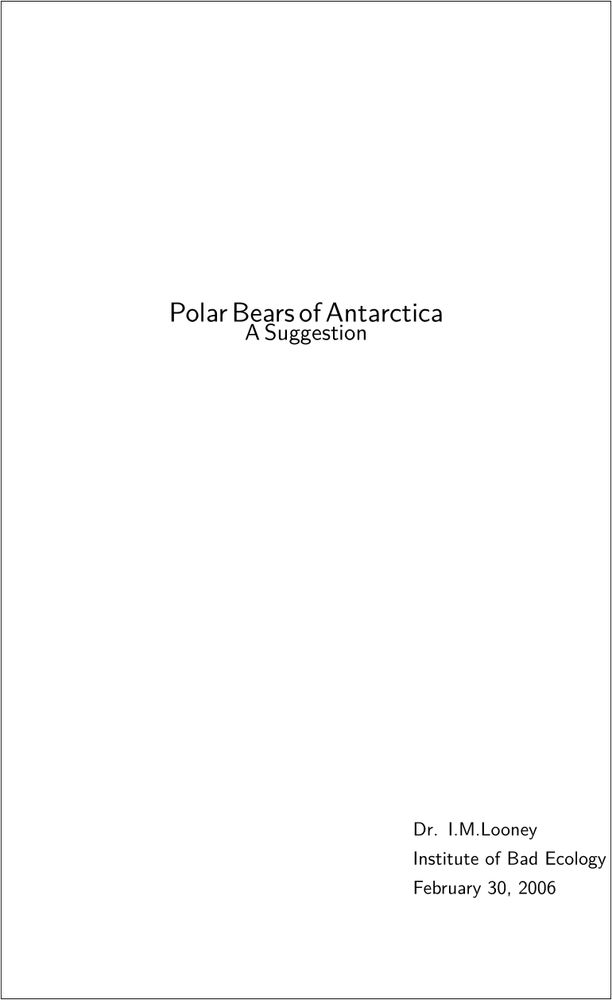 % --- Cover page \dontleavehmode \blank[6cm] \startalignment[center] \ssd Polar Bears of Antarctica \par \ssc A Suggestion \stopalignment \blank[10cm] \startalignment[flushright] \dontleavehmode \ssb \bTABLE \setupTABLE[r][each][frame=off] \bTR \bTD Dr. I.M.Looney \eTD \eTR \bTR \bTD Institute of Bad Ecology \eTD \eTR \bTR \bTD February 30, 2006 \eTD \eTR \eTABLE \stopalignment \page