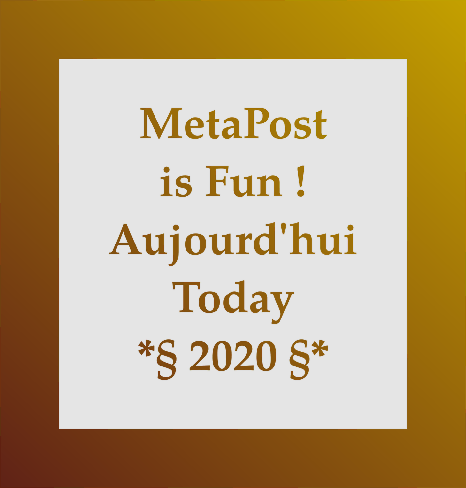 \definecolor [ColorHighA] [h=c4a000] \definecolor [ColorHighB] [h=602217] \definecolor [ColorLow] [0.8(white)] \startMPpage picture tt ; tt := lmt_outline [ kind = "fillup", text = "\definedfont[name:texgyrepagellabold*default]% \framed[frame=off,offset=3mm,align=middle,strut=none] {MetaPost\\is Fun !\\Aujourd'hui\\Today\\*§ 2020 §*}", ] xsized 12cm ; path bb ; bb := (boundingbox tt) && cycle ; path pp ; pp := bb enlarged 2cm ; fill pp withshademethod "linear" withshadedirection (2.,0.) withshadecolors (\MPcolor{ColorHighA}, \MPcolor{ColorHighB}) ; for i within tt : nofill pathpart i; endfor ; eofill bb withcolor "gray"; \stopMPpage