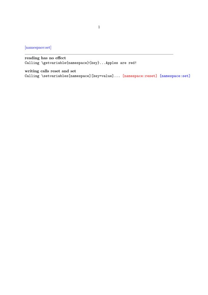 \startsetups namespace:set % Print message to log and to document \writestatus{VARIABLES}{namespace:set is being called..}% \space{\blue[namespace:set]} \def\applecolor{red} % whatever must be done with your variables after you assign a value % (initialisation with defaults,..) \stopsetups \startsetups namespace:reset % Print message to log and document \writestatus{VARIABLES}{namespace:reset is being called..}% \space{\red[namespace:reset]} % whatever must be done after an assignment (verification, calculation,..) \stopsetups % \setups[namespace:set] is automatically called right after 'set' is assigned \setvariables[namespace] [set={\setups[namespace:set]}, key={Apples are \applecolor!}, reset={\setups[namespace:reset]}, ] % watch for the colors \setupcolors[state=start] \starttext \hairline {\bf reading has no effect\par} {\tt Calling \type{\getvariable{namespace}{key}}...\getvariable{namespace}{key}} \blank {\bf writing calls reset and set\par} {\tt Calling \type{\setvariables[namespace][key=value]}...\setvariables[namespace][key=value]} \stoptext