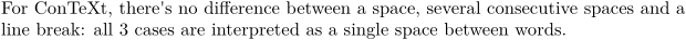 For ConTeXt, there's no difference between a space, several consecutive spaces and a line break: all 3 cases are interpreted as a single space between words.