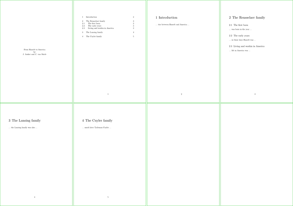 \starttext \startstandardmakeup \midaligned{From Hasselt to America} \midaligned{by} \midaligned{J. Jonker and C. van Marle} \stopstandardmakeup \placecontent \startchapter [title=Introduction] ... ties between Hasselt and America ... \stopchapter \startchapter [title={The Rensselaer family}, reference=rensselaer] \startsection [title={The first born}] ... was born in the year ... \stopsection \startsection [title={The early years}] ... in those days Hasselt was ... \stopsection \startsection [title={Living and workin in America}] ... life in America was ... \stopsection \stopchapter \startchapter [title={The Lansing family}, reference=lansing] ... the Lansing family was also ... \stopchapter \startchapter [title={The Cuyler family}, reference=cuyler] ... much later Tydeman Cuyler ... \stopchapter \stoptext