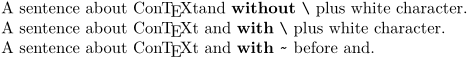 A sentence about \ConTeXt and \bold{without} \tex{} plus white character. A sentence about \ConTeXt\ and \bold{with} \tex{} plus white character. A sentence about \ConTeXt ~and \bold{with} \type{~} before and.