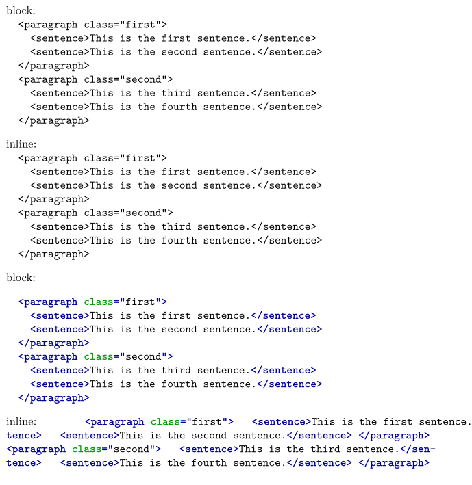 <text> <paragraph class="first"> <sentence>This is the first sentence.</sentence> <sentence>This is the second sentence.</sentence> </paragraph> <paragraph class="second"> <sentence>This is the third sentence.</sentence> <sentence>This is the fourth sentence.</sentence> </paragraph> </text>