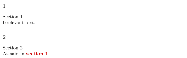 <text> <section id="section-1">Section 1 <p>Irrelevant text.</p> </section> <section id="section-2">Section 2 <p>As said in <a href="#section-1">previous section</a>…</p> </section> </text>