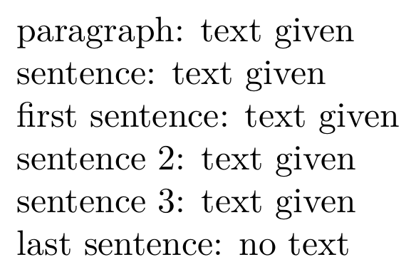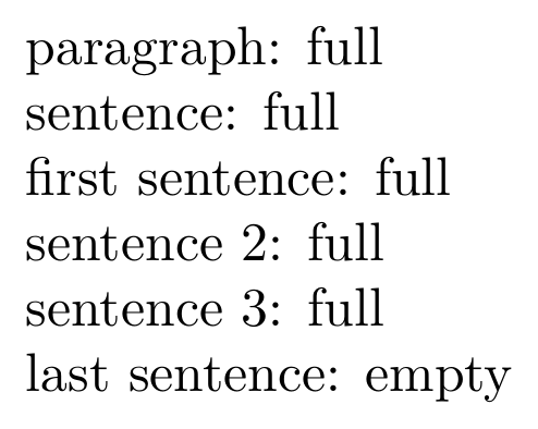 \startxmlsetups xml:text paragraph: \xmldoifelseempty{#1}{paragraph}{empty}{full}\\ sentence: \xmldoifelseempty{#1}{sentence}{empty}{full}\\ first sentence: \xmldoifelseempty{#1}{sentence[position()==1]}{empty}{full}\\ sentence 2: \xmldoifelseempty{#1}{sentence[position()==2]}{empty}{full}\\ sentence 3: \xmldoifelseempty{#1}{sentence[position()==3]}{empty}{full}\\ last sentence: \xmldoifelseempty{#1}{sentence[position()==last()]}{empty}{full} \stopxmlsetups