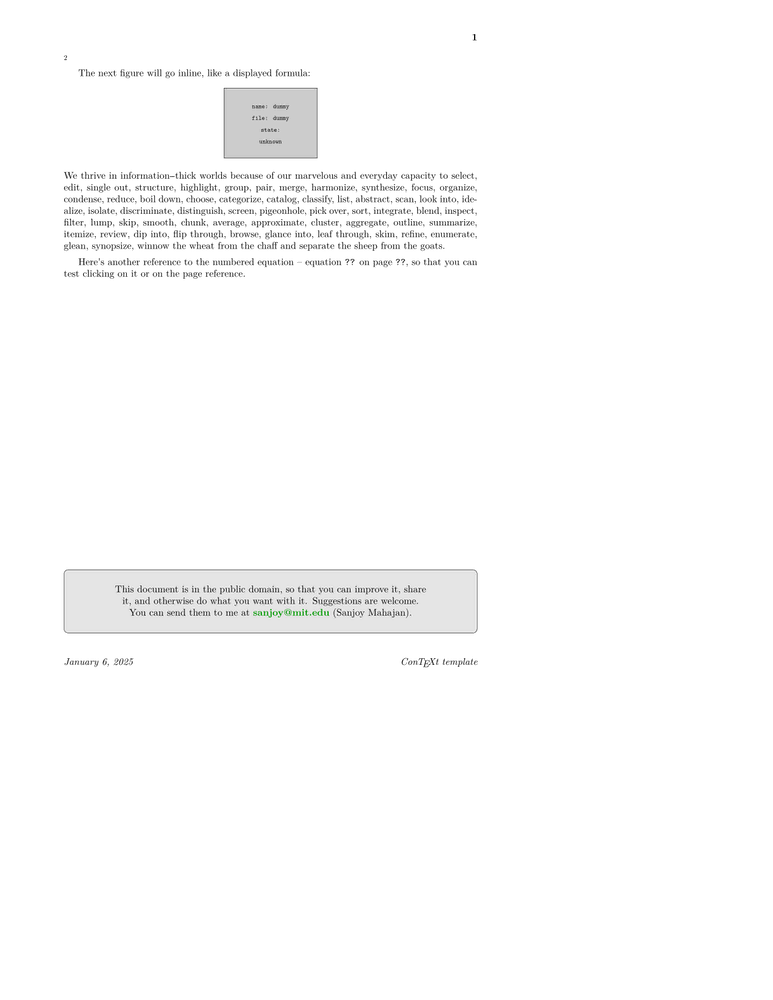 % "Hello world!" document for the ConTeXt typesetting system % % === History === % 2006-12-29 Sanjoy Mahajan <sanjoy@mit.edu> % * Created % % This document is in the public domain (no copyright). \setupcolors[state=start] % otherwise you get greyscale \definecolor[headingcolor][r=1,b=0.4] % for the document info/catalog (reported by 'pdfinfo', for example) \setupinteraction[state=start, % make hyperlinks active, etc. title={Hello world!}, subtitle={A ConTeXt template}, author={Sanjoy Mahajan}, keyword={template}] % useful urls \useURL[author-email][mailto:a.u.thor@somewhere.edu][][a.u.thor@somewhere.edu] \useURL[wiki][http://wiki.contextgarden.net][][\ConTeXt\ wiki] \useURL[sanjoy][mailto:sanjoy@mit.edu][][sanjoy@mit.edu] % for US paper; the sensible default is [A4][A4] (A4 typesetting, % printed on A4 paper) \setuppapersize[letter][letter] \setuplayout[topspace=0.5in, backspace=1in, header=24pt, footer=36pt, height=middle, width=middle] % uncomment the next line to see the layout % \showframe % headers and footers \setupfooter[style=\it] \setupfootertexts[\date\hfill \ConTeXt\ template] \setuppagenumbering[location={header,right}, style=bold] \setupbodyfont[11pt] % default is 12pt \setuphead[section,chapter,subject][color=headingcolor] \setuphead[section,subject][style={\ss\bfa}, before={\bigskip\bigskip}, after={}] \setuphead[chapter][style={\ss\bfd}] \setuphead[title][style={\ss\bfd}, before={\begingroup\setupbodyfont[14.4pt]}, after={\leftline{\ss\tfa A. U. Thor $\langle$\from[author-email]$\rangle$} \bigskip\bigskip\endgroup}] \setupitemize[inbetween={}, style=bold] % set inter-paragraph spacing \setupwhitespace[medium] % comment the next line to not indent paragraphs \setupindenting[medium, yes] \starttext \title{Hello, world!} Here is a hello-world template document to illustrate a few \ConTeXt\ features. Have fun. You can find a lot more information at \from[wiki]; the preceding text should be colored and clickable, and clicking it should take you to the wiki. \subject{A list} Here is an example of a list. \startitemize[a] % tags are lowercase letters \item first \item second \item third \stopitemize \subject{Math} An equation can be typeset inline like $e^{\pi i}+1=0$, or as a displayed formula: \startformula \int_0^\infty t^4 e^{-t}\,dt = 24. \stopformula % don't use $$...$$ (the plain TeX equivalent) You can also have numbered equations: \placeformula[eq:factorial-example]\startformula \int_0^\infty t^5 e^{-t}\,dt = 120. \stopformula And you can refer to them by name. I called the previous equation {\tt factorial-example}, and it is equation \in[eq:factorial-example]. \ConTeXt\ figures out the number for you. And with interaction turned on, you can click on the equation number to get to the equation. \subject{Text with figures} Now text with a few figures. The first figure goes on the right, with the paragraph flowing around it. \placefigure[right,none]{}{\externalfigure[dummy]} \input tufte The next figure will go inline, like a displayed formula: \placefigure[here,none]{}{\externalfigure[dummy]} \input tufte Here's another reference to the numbered equation -- equation \in[eq:factorial-example] on \at{page}[eq:factorial-example], so that you can test clicking on it or on the page reference. % most plain TeX commands work \vfill \noindent \framed[corner=round, width=\textwidth,height=1in, backgroundcolor=gray,background=color] {This document is in the public domain, so that you can improve it, share it, and otherwise do what you want with it. Suggestions are welcome. You can send them to me at \from[sanjoy] (Sanjoy Mahajan).} \stoptext
