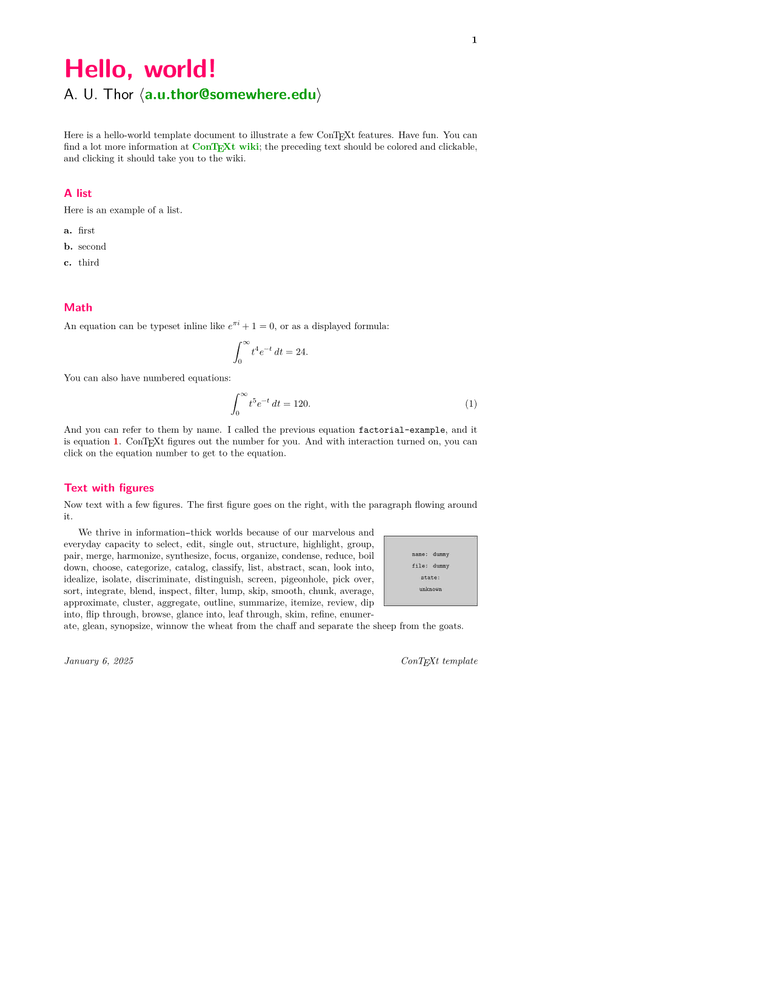 Here is a skeleton document that illustrates several features of ConTeXt: