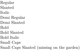 | TODO: install fonts on garden; do a more fancy table (and without "low-level" font commands, but preserving font name somewhere in the table), perhaps sample text with ligatures and diacritical marks as well; perhaps add available sizes somewhere in the table as well (See: To-Do List) |