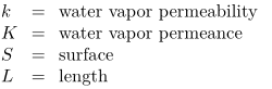 \usemodule[newmat] \startlegend \leg k \\ water vapor permeability \\ \\ \leg K \\ water vapor permeance \\ \\ \leg S \\ surface \\ \\ \leg L \\ length \\ \\ \stoplegend