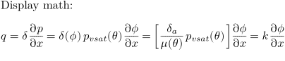 \usemodule[newmat] Display math: \startformula q = \delta \frac{\partial p}{\partial x} = \delta(\phi) p_{vsat}(\theta) \frac{\partial \phi}{\partial x} = \left[ \frac{\delta_a}{\mu(\theta)} p_{vsat}(\theta) \right] \frac{\partial \phi}{\partial x} = k \frac{\partial \phi}{\partial x} \stopformula