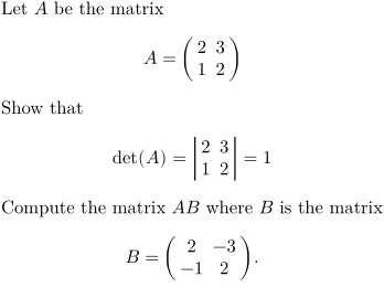 \setuplayout[scale=0.8,width=13cm] \definemathmatrix[pmatrix] % defining matrix with parentheses [matrix:parentheses] [simplecommand=pmatrix] \definemathmatrix[bmatrix] % defining matrix with brackets [matrix:brackets] [simplecommand=bmatrix] \definemathmatrix[determinant] % defining determinant with bars [matrix:bars] [simplecommand=thedeterminant] Let $A$ be the matrix \startformula A = \startpmatrix \NC 2 \NC 3 \NR \NC 1 \NC 2 \NR \stoppmatrix \stopformula Show that \startformula {\rm det}(A) = \startdeterminant \NC 2 \NC 3 \NR \NC 1 \NC 2 \NR \stopdeterminant = 1 \stopformula Compute the matrix $AB$ where $B$ is the matrix \startformula B = \pmatrix{2, -3 ; -1, 2}. \stopformula