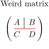 \definemathmatrix[mymatrix][matrix:parentheses] Weird matrix \startformula \startmymatrix \NC A \VL B \NR \HL[red] \NC C \NC D \NR \stopmymatrix \stopformula