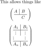 \definemathmatrix[mymatrix][matrix:parentheses] This allows things like \startformula \startmymatrix \NC A \VL B \NR \HL \NC \NC C \NC \NR \stopmymatrix \stopformula \startformula \startmymatrix \NC A_1 \VL B_1 \NR \HL \NC \vdots \VL \vdots \NR \NC \vdots \NC \vdots \NR % there is probably something from here \HL \NC A_n \VL B_n \NR \stopmymatrix \stopformula