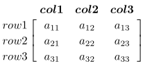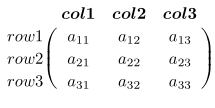 \startformula \startbordermatrix \NC \NC {\bi col 1} \NC {\bi col 2} \NC {\bi col 3}\NR \NC row 1 \NC a_{11} \NC a_{12} \NC a_{13} \NR \NC row 2 \NC a_{21} \NC a_{22} \NC a_{23} \NR \NC row 3 \NC a_{31} \NC a_{32} \NC a_{33} \NR \stopbordermatrix \stopformula