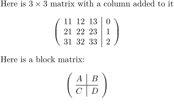 \definemathmatrix[mymatrix] [left={\left\lparent\thinspace}, % instead of the left parenthesis, one can use any other fence right={\thinspace\right\rparent}] % instead of the right parenthesis, one can use any other fence \starttext Here is $3 \times 3$ matrix with a column added to it \startformula \startmymatrix \NC 11 \NC 12 \NC 13 \VL 0 \NR \NC 21 \NC 22 \NC 23 \VL 1 \NR \NC 31 \NC 32 \NC 33 \VL 2 \NR \stopmymatrix \stopformula Here is a block matrix: \startformula \startmymatrix \NC A \VL B \NR \HL \NC C \VL D \NR \stopmymatrix \stopformula