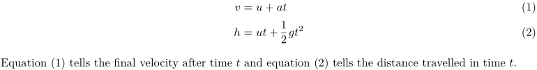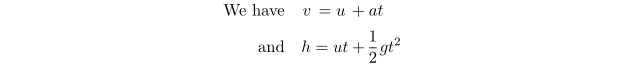 \setuplayout[scale=0.8,width=13cm] \startsubformulas[eq:total] \startplaceformula \startformula \startalign \NC v \NC = u + at \NR[eq:v] \NC h \NC = ut + \frac12 gt^2 \NR[eq:h] \stopalign \stopformula \stopplaceformula \stopsubformulas In~(\in[eq:total]), equation~(\in[eq:v]) tells the final velocity after time~$t$ and equation (\in[eq:h]) tells the distance travelled in time~$t$.