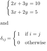 \startformula \startcases[align={right,left},distance=3pt] \NC 2x + 3y \NC = 10 \NR \NC 3x + 2y \NC = 5 \NR \stopcases \stopformula and \startformula \delta_{ij} = \startmathcases \NC 1 \NC \text{if } i = j \NR \NC 0 \NC \text{otherwise} \NR \stopmathcases \stopformula