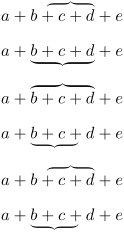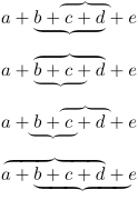 $a + \overbrace [lt=1em] {b+c+d} + e$\blank $a + \underbrace [lt=1em] {b+c+d} + e$\blank $a + \overbrace [rb=1em] {b+c+d} + e$\blank $a + \underbrace [rb=1em] {b+c+d} + e$\blank $a + \overbrace [lt=1em,rb=1em] {b+c+d} + e$\blank $a + \underbrace [lt=1em,rb=1em] {b+c+d} + e$\blank
