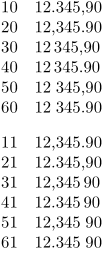 \startlines 10 \setdigitmode {1} \setdigitorder{0} \digits {12,345.90} 20 \setdigitmode {2} \setdigitorder{0} \digits {12,345.90} 30 \setdigitmode {3} \setdigitorder{0} \digits {12,345.90} 40 \setdigitmode {4} \setdigitorder{0} \digits {12,345.90} 50 \setdigitmode {5} \setdigitorder{0} \digits {12,345.90} 60 \setdigitmode {6} \setdigitorder{0} \digits {12,345.90} 11 \setdigitmode {1} \setdigitorder{1} \digits {12,345.90} 21 \setdigitmode {2} \setdigitorder{1} \digits {12,345.90} 31 \setdigitmode {3} \setdigitorder{1} \digits {12,345.90} 41 \setdigitmode {4} \setdigitorder{1} \digits {12,345.90} 51 \setdigitmode {5} \setdigitorder{1} \digits {12,345.90} 61 \setdigitmode {6} \setdigitorder{1} \digits {12,345.90} \stoplines
