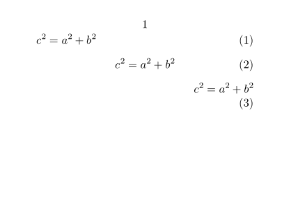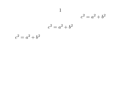 \setuppapersize[A8,landscape] \starttext \setupformulas[align=left] \startformula c^2 = a^2 + b^2 \stopformula \setupformulas[align=middle] \startformula c^2 = a^2 + b^2 \stopformula \setupformulas[align=right] \startformula c^2 = a^2 + b^2 \stopformula \stoptext