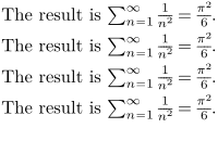 \startlines The result is $\sum_{n=1}^{\infty} \frac{1}{n^2} = \frac{\pi^2}{6}$. The result is \m{\sum_{n=1}^{\infty} \frac{1}{n^2} = \frac{\pi^2}{6}}. The result is \math{\sum_{n=1}^{\infty} \frac{1}{n^2} = \frac{\pi^2}{6}}. The result is \mathematics{\sum_{n=1}^{\infty} \frac{1}{n^2} = \frac{\pi^2}{6}}. \stoplines