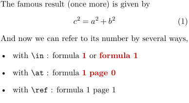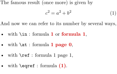 \setupinteraction[state=start] \definereferenceformat[eqref][left=(,right=)] The famous result (once more) is given by \startplaceformula[eq:myref] \startformula c^2 = a^2 + b^2 \stopformula \stopplaceformula And now we can refer to its number by several ways, \startitemize \item with \tex{in} : formula \in[eq:myref] or \in{formula}{}[eq:myref], \item with \tex{at} : formula \in[eq:myref] \at{page}[eq:myref], \item with \tex{ref} : formula \ref[number] [eq:myref] page \ref[number] [eq:myref], \item with \tex{eqref} : formula \eqref[eq:myref]. \stopitemize