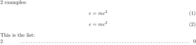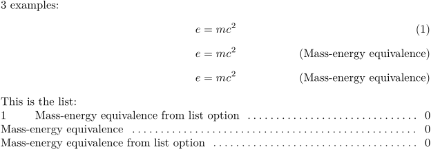 3 examples: % a reference + list ==> entry with number + additional text in the list \startplaceformula [reference=formula:mass2, list={Mass-energy equivalence from list option}] \startformula e=mc^2 \stopformula \stopplaceformula % a reference + title ==> entry with title text, no number \startplaceformula [title={Mass-energy equivalence}, % <====== here reference=formula:mass3] \startformula e=mc^2 \stopformula \stopplaceformula % a reference + title + list ==> entry with list text, no number \startplaceformula [title={Mass-energy equivalence}, % <====== here reference=formula:mass4, list={Mass-energy equivalence from list option}] \startformula e=mc^2 \stopformula \stopplaceformula This is the list: \placelist[formula][criterium=all,alternative=c]