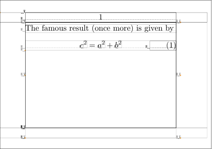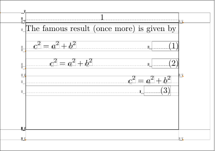 \setuppapersize[A8,landscape] \starttext The famous result (once more) is given by \showboxes \setupformulas[align=right,leftmargin=1em] \startplaceformula \startformula c^2 = a^2 + b^2 \stopformula \stopplaceformula \setupformulas[align=right,leftmargin=3em] \startplaceformula \startformula c^2 = a^2 + b^2 \stopformula \stopplaceformula \setupformulas[align=left,rightmargin=1em] \startplaceformula \startformula c^2 = a^2 + b^2 \stopformula \stopplaceformula \stoptext