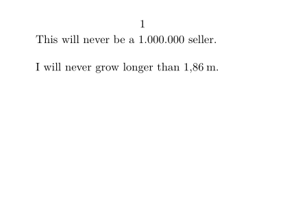 \usemodule[units] \setuppapersize[A8,landscape] \setdigitmode {1} \starttext This will never be a \digits{1,000,000} seller. \blank[line] I will never grow longer than \digits{1.86} \unit{m}. \stoptext