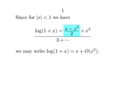 \setuppapersize[A8,landscape] \definemathframed[coloredmath] [ frame=off, location=mathematics, background=color, backgroundcolor=lightcyan, backgroundoffset=1pt ] \starttext Since for $|x| < 1$ we have \startformula \log(1+x) = \coloredmath{x- \displaystyle{x^2\over2}} + {x^3 \over 3} + \cdots \stopformula we may write $\log(1+x) = x + O(x^2)$. \stoptext