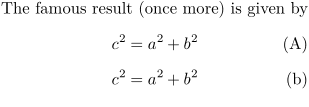 The famous result (once more) is given by \setupformulas[numberconversion=Character] \startplaceformula \startformula c^2 = a^2 + b^2 \stopformula \stopplaceformula \setupformulas[numberconversion=character] \startplaceformula \startformula c^2 = a^2 + b^2 \stopformula \stopplaceformula