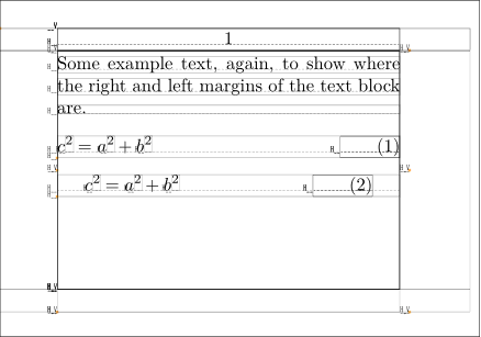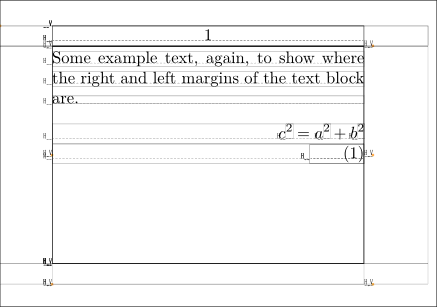 \setuppapersize[A8,landscape] \starttext Some example text, again, to show where the right and left margins of the text block are. \showboxes \setupformulas[align=left,distance=2em] \startplaceformula \startformula c^2 = a^2 + b^2 \stopformula \stopplaceformula \stoptext