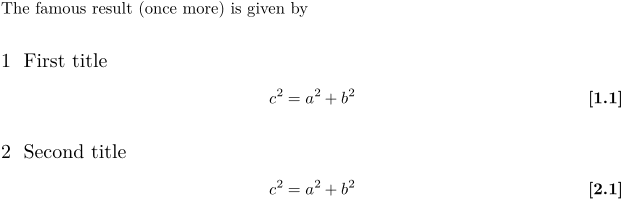 The famous result (once more) is given by \setupformulas [left={[}, right={]}, numberstyle=bold] \setupnumbering [way=bysection] % to add the section number to the formula number \setupnumber [formula] [way=bysection] % to reset with each new section \startsection[title=First title] \startplaceformula \startformula c^2 = a^2 + b^2 \stopformula \stopplaceformula \stopsection \startsection[title=Second title] \startplaceformula \startformula c^2 = a^2 + b^2 \stopformula \stopplaceformula \stopsection