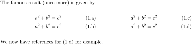\definereferenceformat[eqref][left=(,right=)] The famous result (once more) is given by \startsubformulas[eq:total] \startplaceformula \startformulas \startformula \startalign \NC a^2 + b^2 \NC = c^2 \NR[eq:first] \NC a^2 + b^2 \NC = c^2 \NR[eq:second] \stopalign \stopformula \startformula \startalign \NC a^2 + b^2 \NC = c^2 \NR[eq:third] \NC a^2 + b^2 \NC = c^2 \NR[eq:forth] \stopalign \stopformula \stopformulas \stopplaceformula \stopsubformulas We now have references for \eqref[eq:forth] for example.