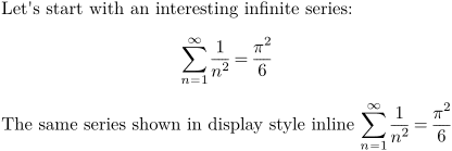 Let's start with an interesting infinite series: \startformula \sum_{n=1}^{\infty} \frac{1}{n^2} = \frac{\pi^2}{6} \stopformula The same series shown in display style inline \dm{\sum_{n=1}^{\infty} \frac{1}{n^2} = \frac{\pi^2}{6}}
